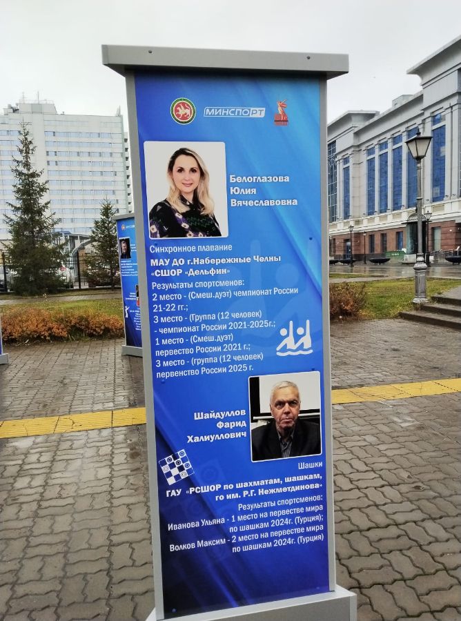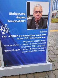 На стенде выставки Минспорта РТ, посвященной достижениям спортсменов и тренеров, представлен Фарид Халиуллович Шайдуллов — тренер нашей школы с 43-летним стажем, настоящая легенда республиканского спорта.